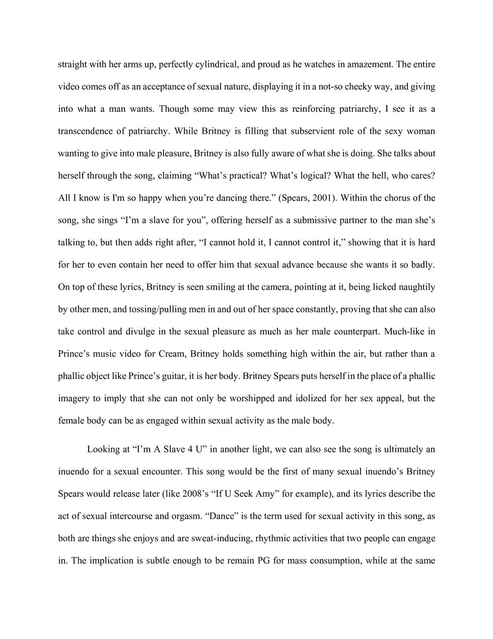 This is a critique of Britney Spears' 2001 hit-single "I'm A Slave 4 U," discussing Britney's sexual empowerment, cry for freedom, and transition from girlhood to womanhood.